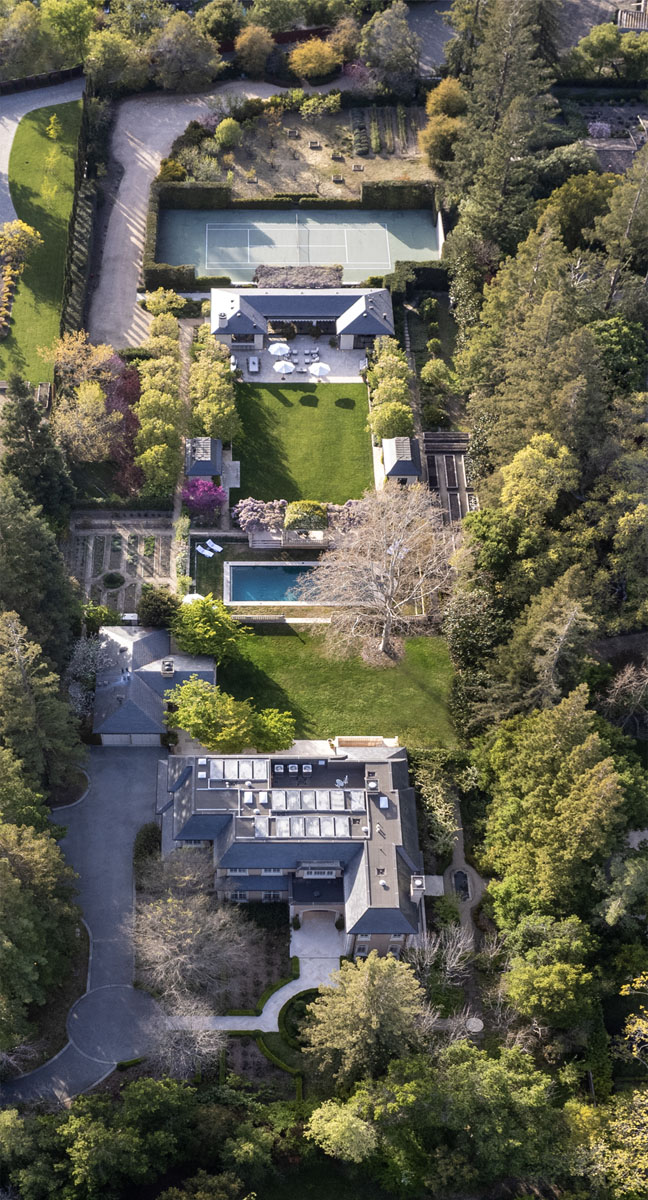 Situated on two separate adjoining parcels, each at the end of a quiet cul-de-sac, this property affords complete privacy. It is located in the most exclusive ZIP code in the country and is just minutes away from prestigious institutions such as Stanford University, venture capital centers, private jet facilities, and international airports.
